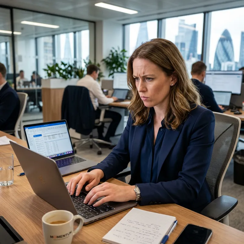 A realistic image of a Caucasian businesswoman with shoulder length brown hair. She is professionally dressed in a navy blue business suit. Her focus is intense, mirrored in her furrowed brow and pursed lips as she works diligently on a sleek, modern laptop. Her fingers fly across the keyboard while her eager eyes scan the screen, deeply engrossed in her task.