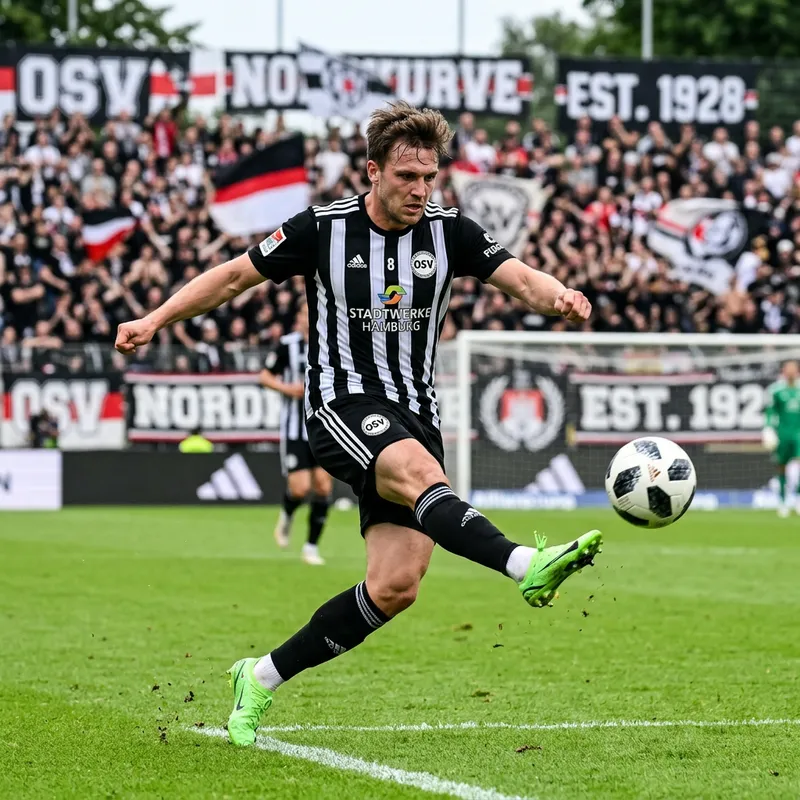 A football player wearing the jersey of the Oststeinbeker Sportverein, a prominent soccer club based in Germany. The player is Caucasian male physically fit and in his mid 20s. He's kicking a black and white football with great force. The soccer field's green grass under his feet, and the crowd in the background cheering for him. The jersey is primarily black with white stripes, displaying the club's official logo prominently. His athletic shorts are also black, and his cleats are a contrasting neon green.