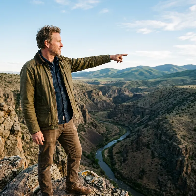A Caucasian man looking at the horizon in a three-quarter profile. He's pointing with his index finger towards the horizon, seemingly longing to reach it. However, a sinuous and challenging terrain separates him from this objective. The sky is blue, and the horizon appears to be a pleasant, albeit distant, place to reach.