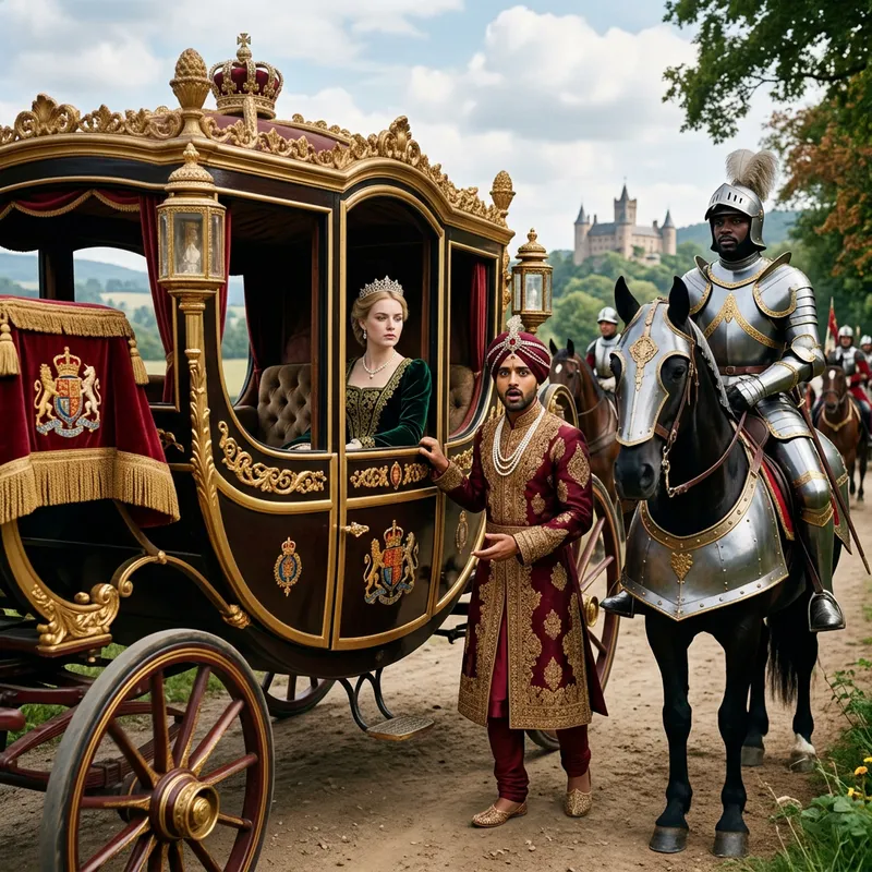 A Caucasian princess rejecting a South Asian prince aboard her carriage, accompanied by another knight of African descent. The princess has an expression of indifference while the prince looks surprised, standing beside the lavish, ornately decorated carriage. The other knight, wearing his full shining armor, stands tall on the horse nearby, observant and silent.