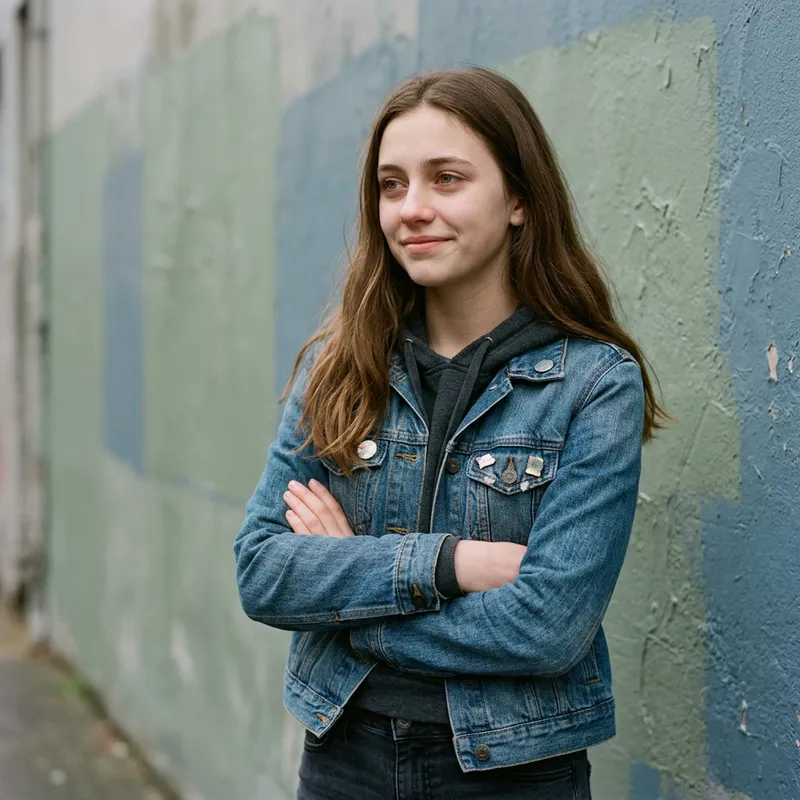 A Caucasian teenage girl with long brown hair, hiding her fear and loneliness behind a seemingly happy, fading smile while standing against a muted color backdrop. She's dressed in a casual jean jacket and is trying to convey strength and optimism despite her internal struggles.