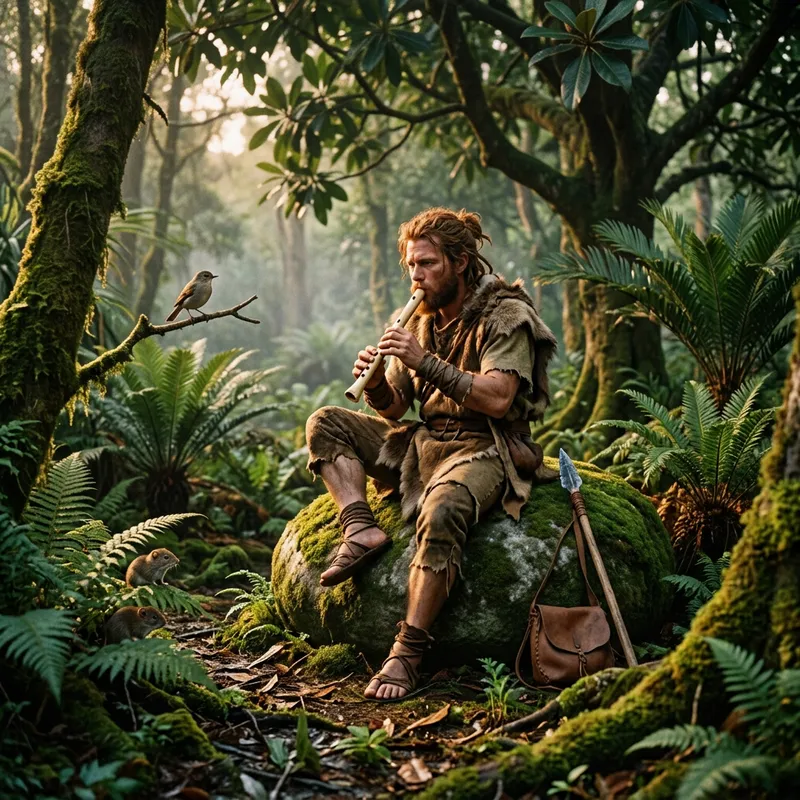An image capturing a paleolithic scene showcasing a caveman of Caucasian descent. He's taking a moment's respite atop a rugged, moss-covered boulder in the middle of a lush, prehistoric forest. In his calloused hands, he fingers an ancient flute, beautifully made from bone. The melody he plays is haunting, echoing through the thick forest and announcing his presence to the world. Nature itself seems to be pausing, with small critters and birds keenly listening to the primitive music. The setting sun casts long shadows, and the damp forest floor is teeming with ferns and primitive plants.