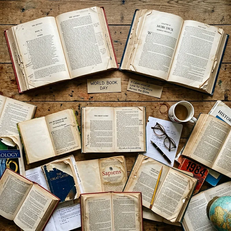 An overhead view of well-worn hardcover books and textbooks, spread open on a table. The covers and pages show signs of frequent use. Two books, their open pages facing up, form the background. This scene is conceived as a celebration of World Book Day, reflecting the significance and love of literature across the globe.