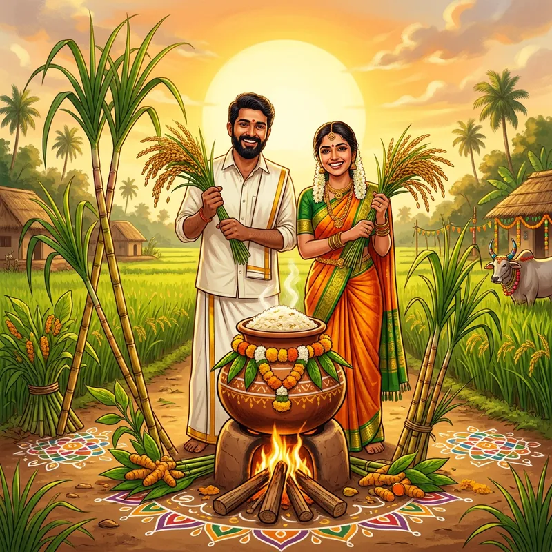 An illustration expressing the celebration of Pongal, a South Indian harvest festival. In the forefront, an earthenware pot is filled to the brim with Pongal (a creamy, sweet rice dish). The pot is placed over a traditional firewood setup surrounded by sugarcane stalks. In the background, a South Asian man and woman, both dressed in traditional Indian attire, stand smiling, holding up handfuls of harvested paddy. A bright sun dominates the sky behind them, casting a warm, golden light over the scene. Beautiful 'Kolam' designs (traditional Indian art form) adorn the ground beneath the setup, signifying prosperity.