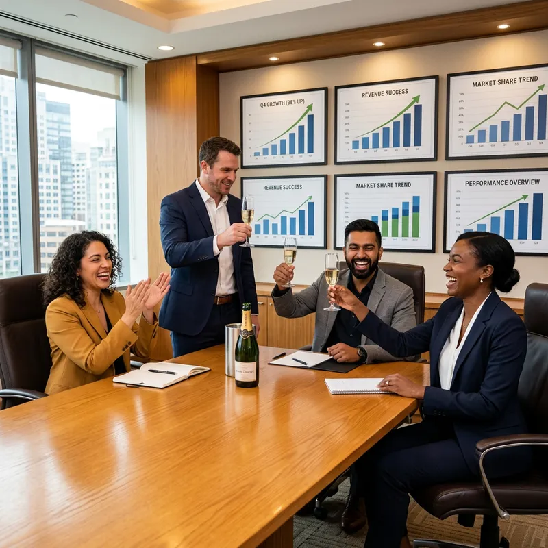 Picture an office meeting room with a large oak table and comfortable leather chairs. On the walls, hang framed charts and graphs showing an upward trend, a symbol of business success. At the table, a group of business colleagues are celebrating. One is a black woman in a tailored suit. The other is a South Asian man sporting a jubilant smile. A third is a white man holding up a glass in a toast while an Hispanic woman claps her hands in delight. The expressions on their faces reflect ultimate business triumph and satisfaction.