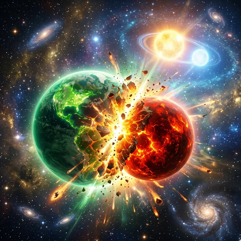 Celestial Collision: A Cosmic Ballet of Green and Red Planets