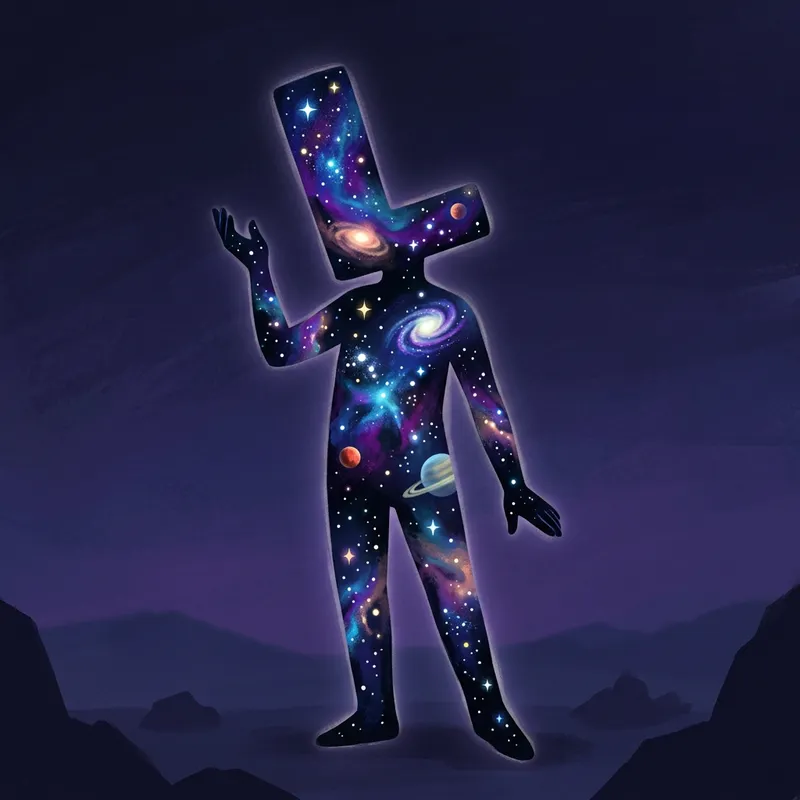 Create an expressive image of a human silhouette in black, reminiscent of a celestial void, filled with elements of the cosmos such as twinkling stars, spiral galaxies, and colorful planets. The form of this person is similar to a character from a popular animation, with a distinctive twist: the head is uniquely shaped like the letter 'L'. This image has an abstract and surrealistic vibe.