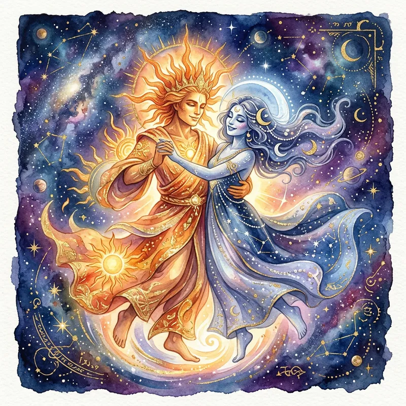 celestial sun and moon entwined in cosmic dance, in the style of vibrant watercolor and gold leaf, radiant and serene expressions, ethereal light radiating from each, digital painting with intricate details and textures, fantasy-inspired