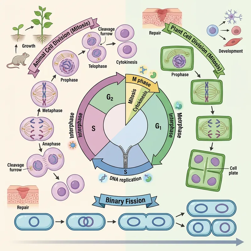 Visualize the process of cell division in various types of cells, including the different biological entities involved. Show the phases of the cell cycle, indicating growth, development, repair and various molecular events happening over a span of time. The illustration should be simple with no text.