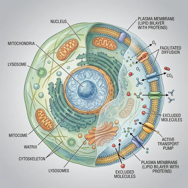 Depict a biological model of a cell, it's with a protective layer surrounding it known as the membrane. It's a porous layer that intelligently decides what substances can enter or exit the cell. Illustrate this crucial cellular structure with a semi-transparent characteristic so that we can get a glimpse of the organelles within.
