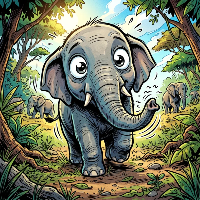 A cute baby elephant with wide eyes and a trembling trunk is depicted in a cell-shading style reminiscent of comic books. Notably, the image showcases the vibrancy of colors and an exaggeration of facial expressions. This visual narrative is captured as if taken by a powerful camera from a low-angle shot, providing a whimsical perspective of nature. Please note that the illustration should carry the distinct strokes and line-work associated with comic books, representing a playful interaction between realism and imagination.