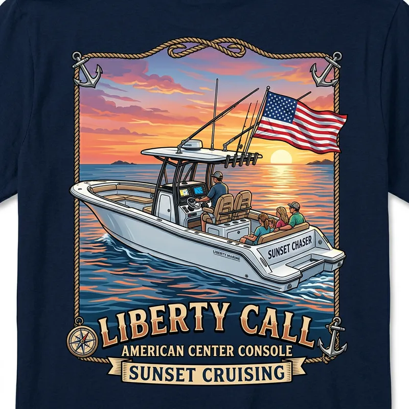 Design an image for a t-shirt displaying a center console boat sailing on open waters. Please include the American flag, fluttering in the breeze, attached to the rear of the boat. The boat should be equipped with comfortable onboard seating and a stylishly designed center console, complete with modern control panels. The sky is a picturesque blend of warm sunset colors while calm waters surround the boat. Please generate the design with a balance of color and clarity to ensure crisp printing on a t-shirt.