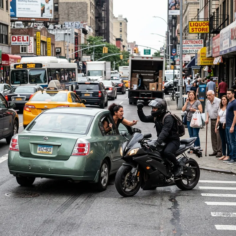 Depict a chaotic street scene showing a metallic green car and a matte black motorcycle neither adhering to traffic rules, exchanging expressions of road rage. The car driver, a Hispanic woman, leans out the window, shouting, while the South Asian male motorcyclist raises a fist. Their immediate surroundings should reflect their reckless behavior with nearby traffic being disrupted, and pedestrians on the sidewalk appearing startled and concerned. Consider emphasizing the hurried, erratic movements of the vehicles in the image to conveymore visual drama of the situation.