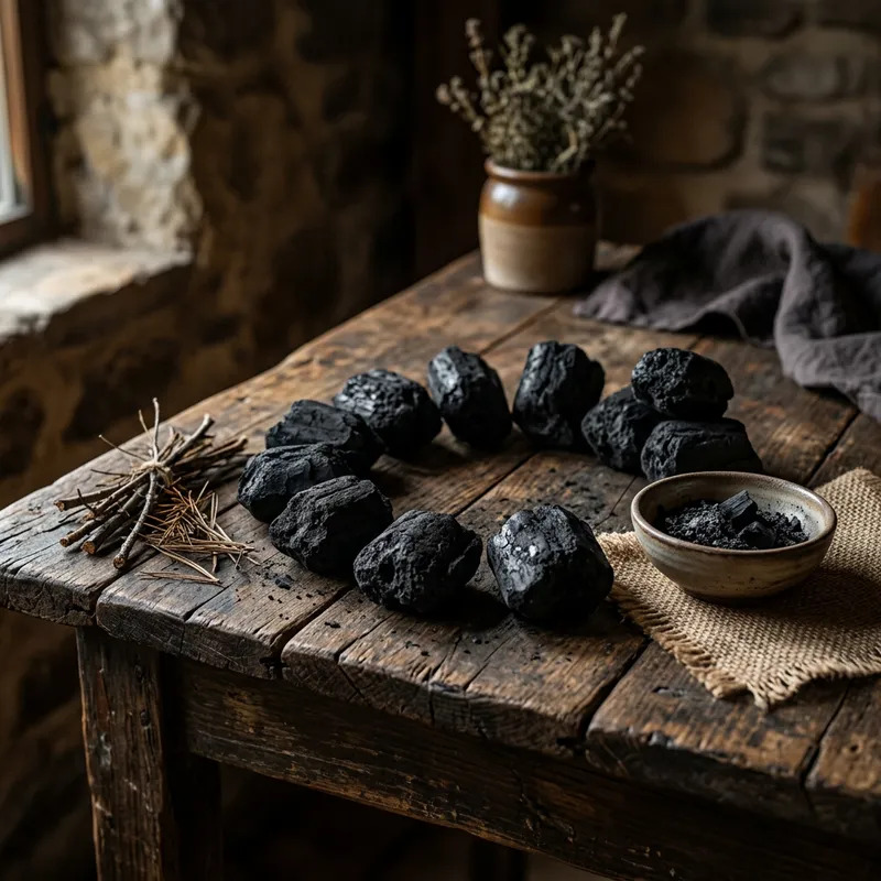 charcoal briquettes arranged artistically on a weathered wooden table, in the style of classic still life with rich earthy tones, soft textures, and a focus on the contrast of rough surfaces, delicate interplay of light and shadow, high-resolution digital painting, nature-inspired.