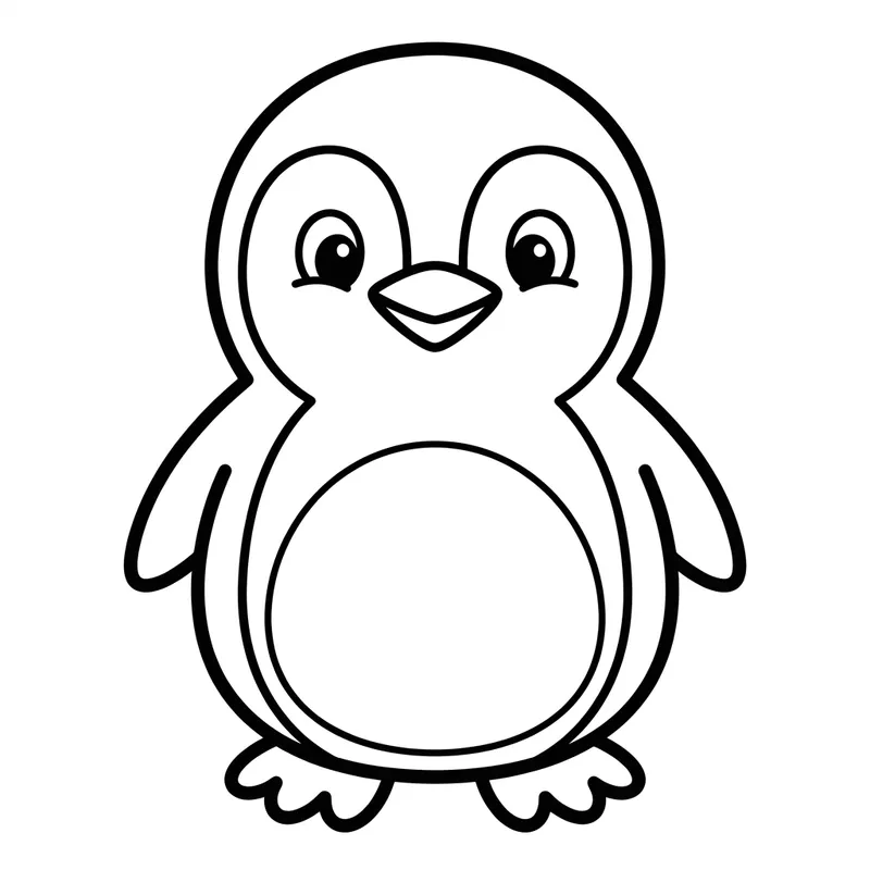 An illustration of a charming, adorable, cartoon-style penguin. This simplistic black line art design recalls the whimsical charms of vintage children's book art, making it an ideal template for coloring. With its simple shapes and smooth lines, it is suitable for a 3-year-old child, serving as a perfect canvas for crayons or colored pencils.