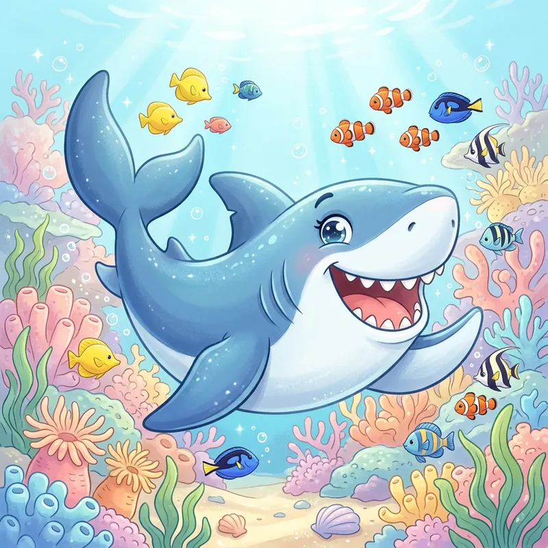Create a lovable cartoon illustration of a shark. The shark should have a design suitable for children, featuring large, twinkling eyes and a vibrant, cheerful smile. Its body should be robust yet appear gentle, reflecting the style of endearing cartoons. The color pallet should center around shades of blue, with a white underbelly. Incorporate subtle shades of soft pink for the interior of its mouth. Include small, non-threatening teeth. The shark's fins and tail should be magnified in size for added cartoonish flair. Position this friendly shark in an underwater backdrop with pastel-colored corals and several petite, vividly tinted fishes surrounding it.