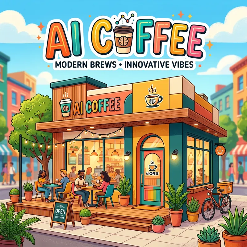 charming coffee shop building, vibrant and eye-catching design, styled in a modern minimalistic aesthetic with warm tones, inviting atmosphere, bold and playful text overlay "AI Coffee", digital illustration with vivid colors, ideal for an online thumbnail