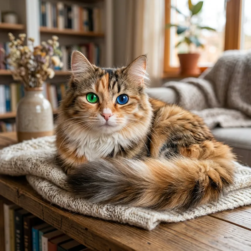 A detailed image of a domestic feline. This charming cat possesses a soft, multi-layered coat sheen, reflecting ambient light. Its eyes are wide and curious; one eye glows with a rich emerald hue, and the other is a deep sapphire shade. The cat has a small, pink nose that stands out against its fur. The feline's expression is peaceful and content, and its pose mirrors that calmness. Fox-like tail curls around its body fluffily. The scene is completed by a softly blurred background of household items, suggesting the cat's relaxed domesticity.