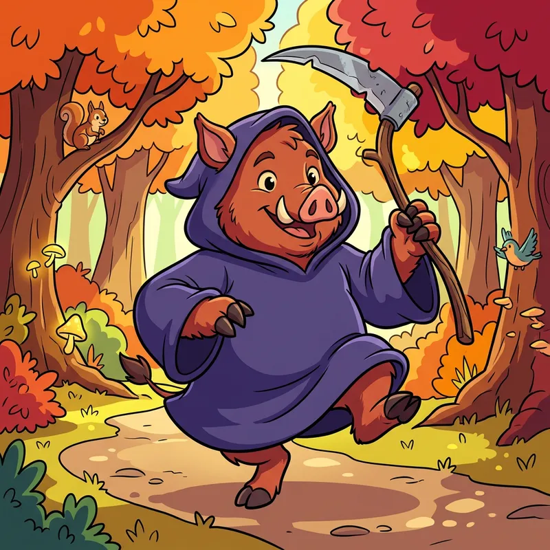 A whimsical illustration featuring a charming humanoid boar having distinct facial features and characteristics of a boar, but with a humanoid stature and aura. The boar is garbed in a shadowy, dark robe adding a mysterious charm to its appearance. With its hoof-like hands, it's gently clutching on to a death scythe, an iconic symbol of grim reaper. Despite its ominous outfit, the boar exudes an energy of joy, walking with an upbeat skip, reminiscent of a child's jubilant gait. The scene is presented in the style of cell shading art known for its vibrant colors and strong outlines.