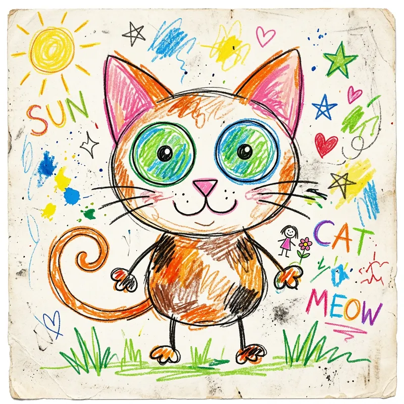 A charming and innocent illustration, created as if drawn by a kid. The picture features a cat, with all its delightful innocence. The cat possesses exaggerated round eyes, perhaps colored in various shades of bright green, and ears like triangles painted in pink. The body, an oversimplified yet recognizable shape filled with bold, solid lines displays colors commonly associated with a cat. Around the cat, there may be signs of youth enthusiasm, like scribbles, random splashes of color, and disproportionate figures. The background looks like a sheet of white drawing paper.