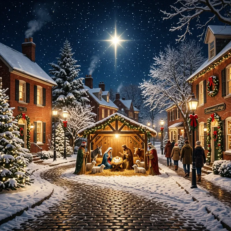 Create an image of a nativity scene situated in a charming neighborhood. The setting is quaint, with brick houses, cobblestone streets, and glowing street lamps. Majestic, frost-covered trees line the street, and joyous holiday decorations adorn the facades of the houses. A serene, star-lit sky serves as a backdrop with a glowing star illuminating the nativity scene set up in the heart of the neighborhood.
