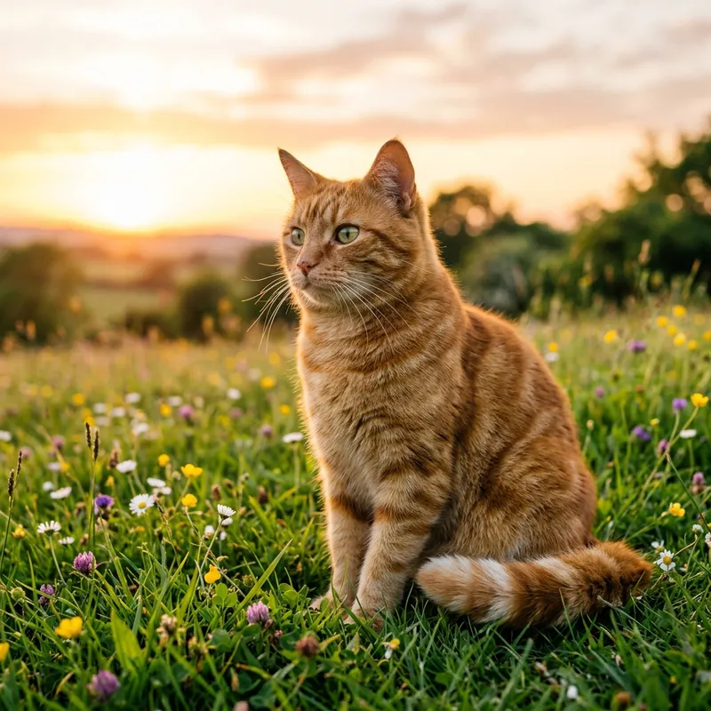 In the serene beauty of nature, an orange tabby cat with piercing green eyes is situated. The cat's whiskers are groomed impeccably, its ears are perked with curiosity, and its lush tail sways gently. There's a playful gleam in its eyes that's soft and warm. Its gazes off into the distance, it seems as if it's contemplating the mysteries of life, or perhaps, simply looking for the next object to pounce on. Beneath it, there's a carpet of green grass sprinkled with a few wildflowers. Light from the setting sun illuminates the entire scene, creating an image of pure tranquility and contentment.
