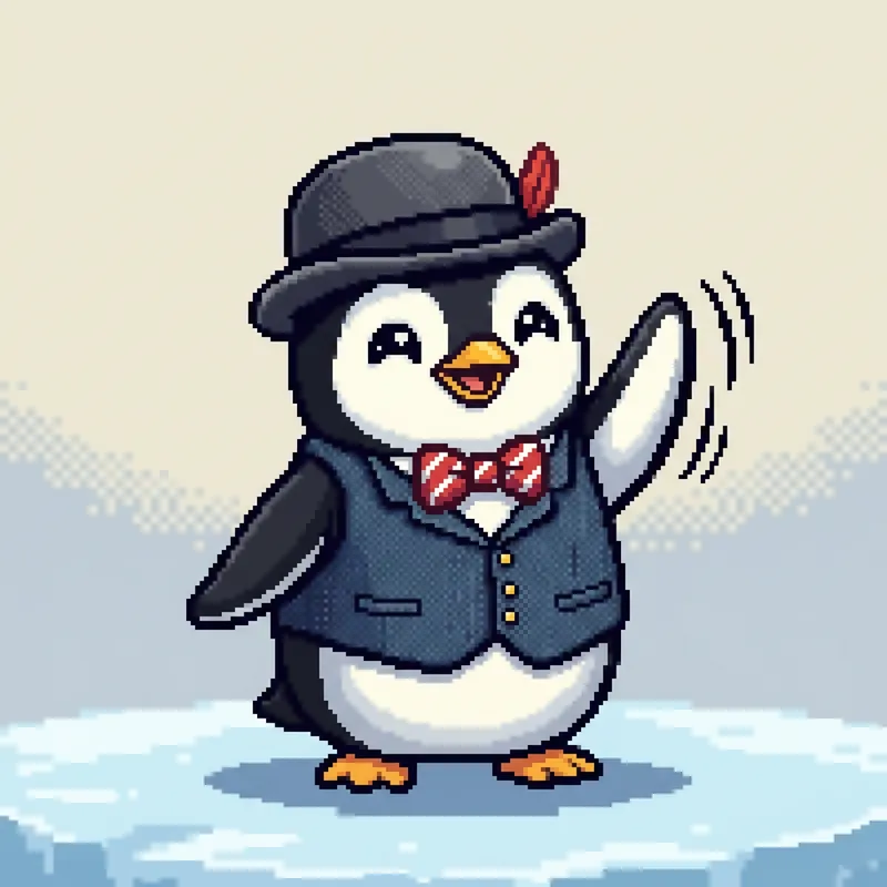 A charming pixel art scene showing a happy little penguin dressed chickly, with a neat hat perched atop its head. The penguin is propelling one flipper back and forth in an enthusiastic wave, its face alight with a warm, contagious smile. The backdrop is neutral, allowing the penguin and its actions to dominate the scene visually.