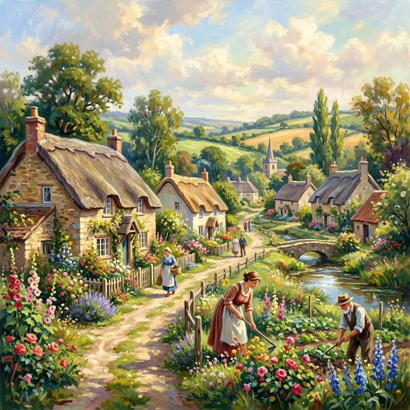 charming rural village, picturesque cottages with thatched roofs, in the style of impressionist painting, vibrant colors and soft brushstrokes, tranquil scene with villagers tending to gardens, digital painting with a focus on light and atmosphere, pastoral genre.