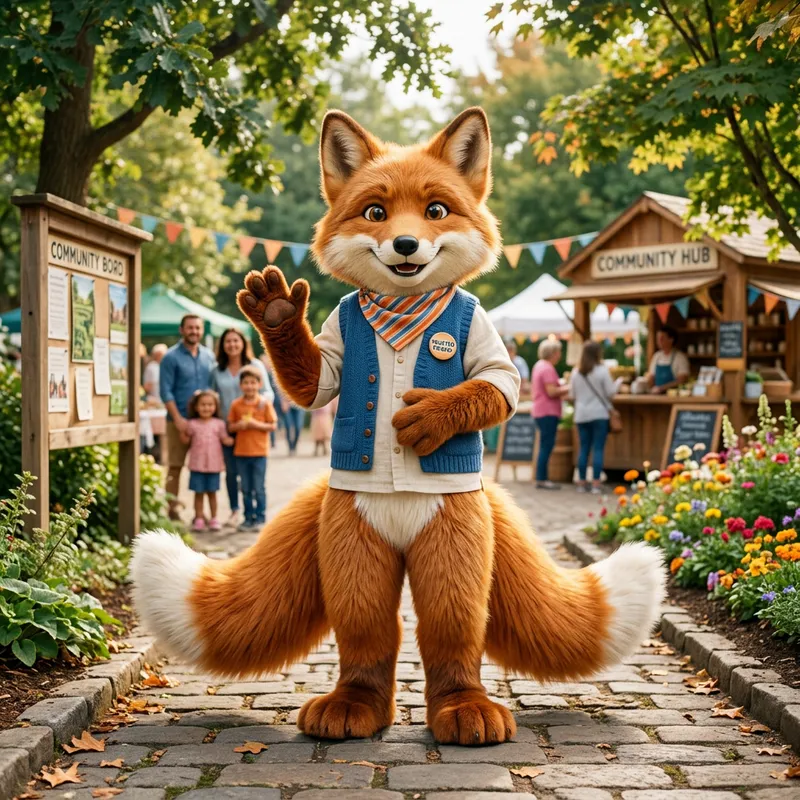 A charming mascot that takes the form of an upright fox. The fox, with its endearing and warm personality, radiates an aura that instantly gives you a sense of trust. It exhibits a handsome visage with its well-groomed fur and sparkling eyes that exude a playful, yet composed demeanor. The mascot is designed to be cute and attractive, with its big fluffy tail, pointy ears, and small button-like nose adding to its adorable charm. The image conveyed should evoke trust and warmth, generating a strong connection between the viewer and the mascot.