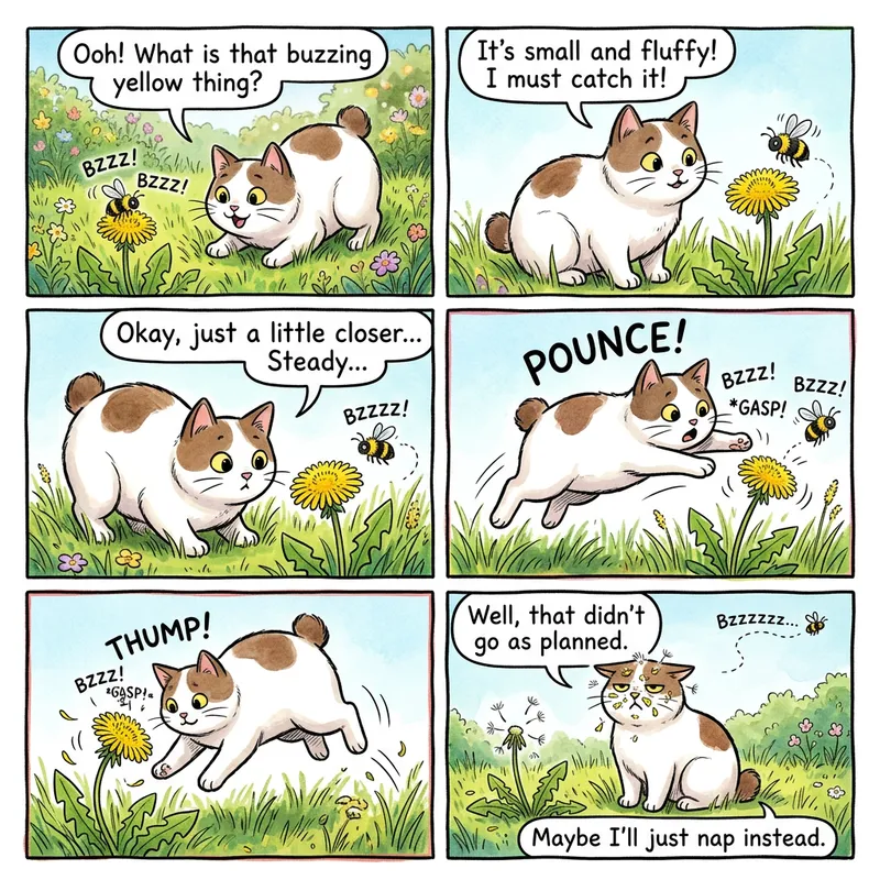 Generate a short comic strip with approximately five frames. In the first scene, depict a plump and charming white cat with a few brown patches, noticeable for its bobtail characteristic. The cat is positioned outdoors, its attention riveted on a buzzing bee circling around a vibrant yellow dandelion.