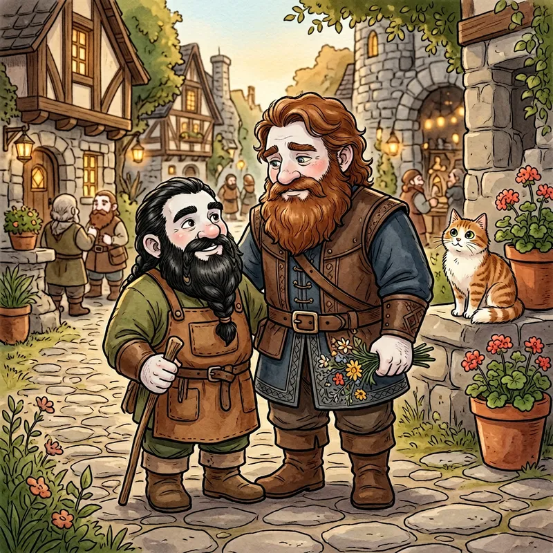Create an illustration of a charming, white-skinned dwarf with black hair standing next to another dwarf, who is visibly taller. This taller dwarf also has white skin, but with slightly chestnut hair. It's clear that the taller dwarf is in love with the shorter one, as indicated by dreamy eyes and affectionate expressions. In the background of the scene, there's a cute cat, quietly observing the two dwarfs with an endearing look.