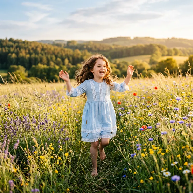 An image depicting a charming young girl of Caucasian descent. She has bright, laughing eyes and waves of chestnut brown hair spilling over her shoulders. She is wearing a pastel-colored dress, decorated with delicate lace detailing while she is frolicking in an idyllic sunlit meadow, filled with wildflowers of assorted colors. A gentle breeze stirs the long grass around her, creating a serene and tranquil atmosphere. The girl is the main focus of the image with the beautiful backdrop of mother nature surrounding her.