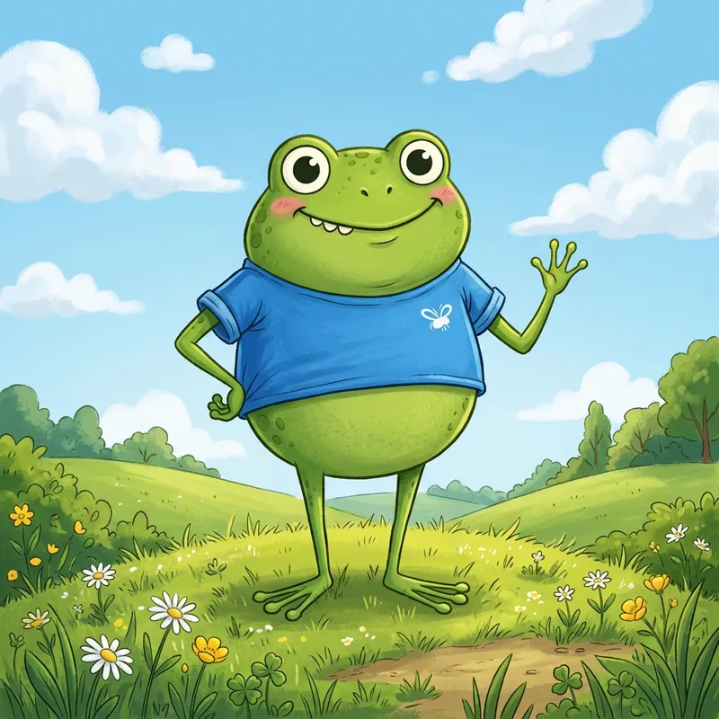 An illustration of a green anthropomorphic frog with circular eyes, a round body, and thin limbs. The frog exhibits a cheeky grin and wears a blue t-shirt. It's standing on a grassy knoll beneath a clear blue sky dotted with a few fluffy, white clouds.