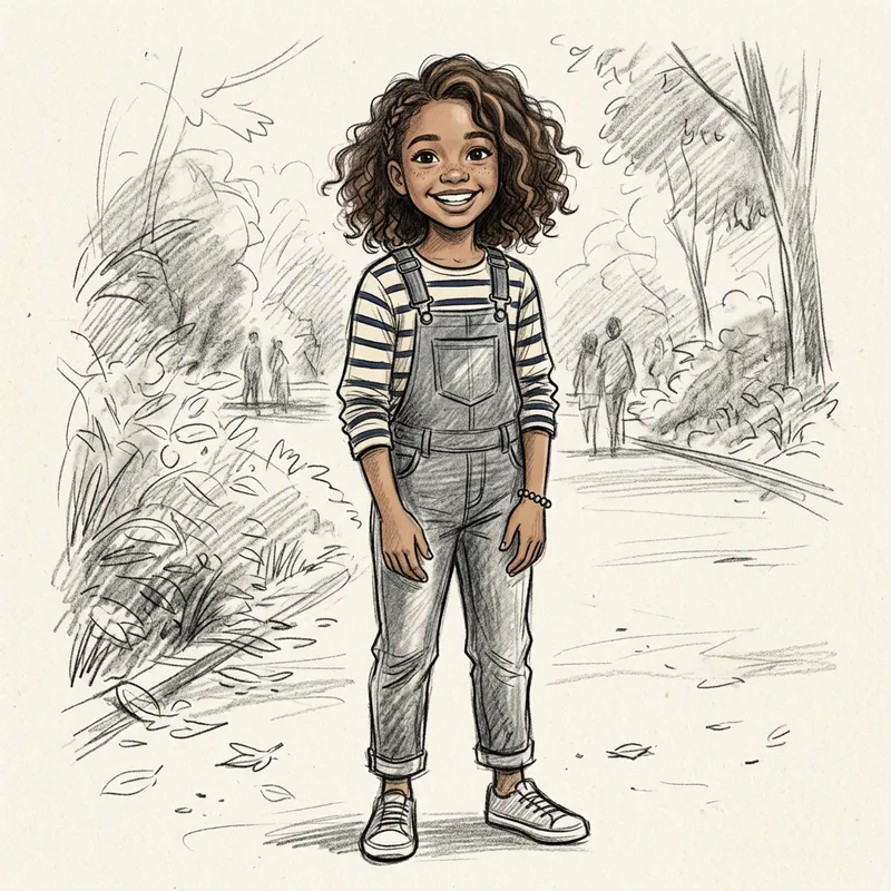 An 11-year-old girl with brown skin and slightly curly hair adorned with highlights. She is wearing casual clothes suitable for her age. She appears to be cheerful, standing in a relaxed posture. Capture her broad smile and expressive eyes to display her youthful energy. Please create a sketch type drawing.