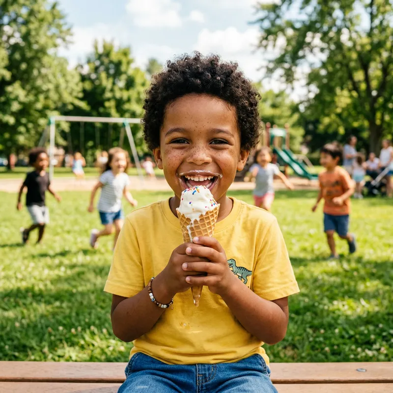 Portrait of a young boy. He is of black descent and has dark curly hair. He has a sparkling bundle of freckles on his cheeks, adding an extra charm to his wide, joy-filled brown eyes. He is joyously eating an ice cream cone, the innocence and glee of youth are clearly evident in his demeanor. He is dressed in a bright yellow T-shirt and denim shorts. Behind him is a grassy park with kids of various descents and gender happily playing, the sense of a cheerful, sunny day prevails.