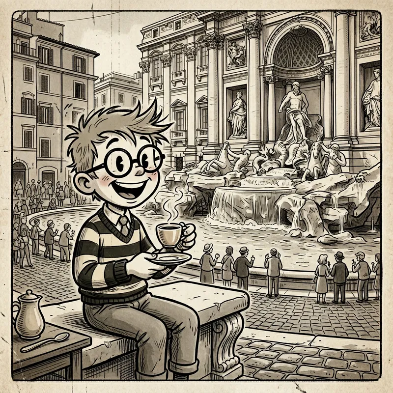 A cheerful Caucasian boy with dark blonde spiky hair and black glasses is happily enjoying a cup of coffee next to the Trevi Fountain. He is depicted in a classic cartoon style, evocative of early 1910s animation aesthetics.