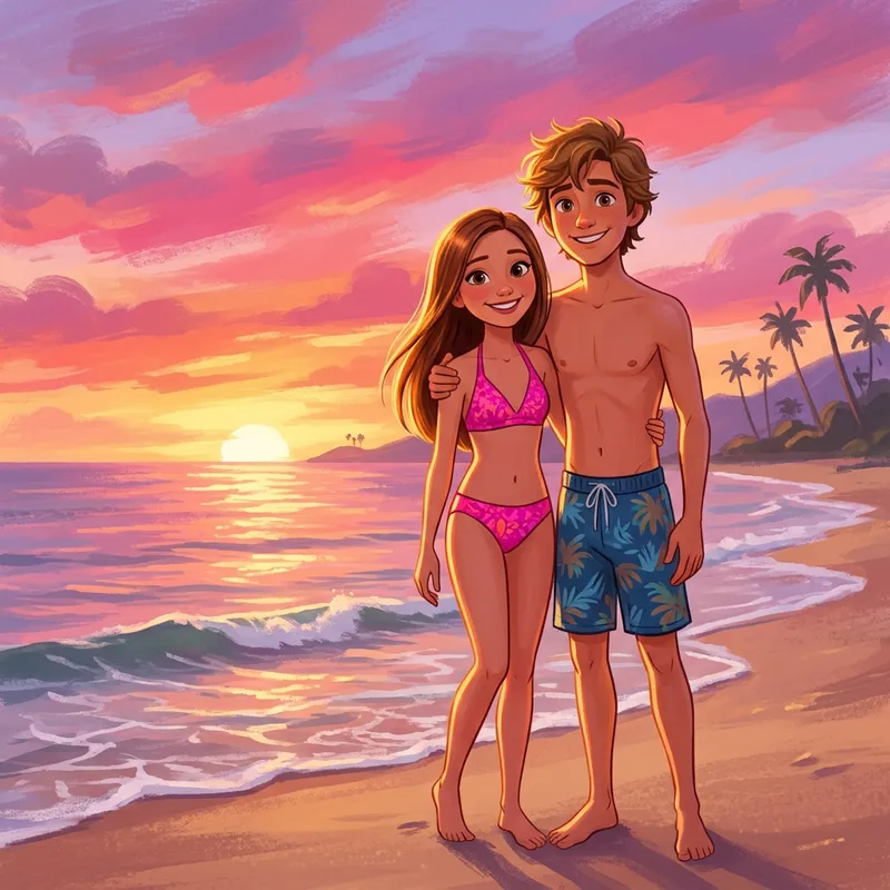 An illustrative style image as seen on animated movie covers. It features a shirtless boy with brown hair on the right, connecting his head to a girl on his left, who is also portrayed with long, straight brown hair and a glowing smile. She's wearing a pink bikini, and they both are looking forward. Looming behind them is a stunning marine sunset, painting the sky with breathtaking hues of pink and orange, the perfect backdrop for this cheerful scene.