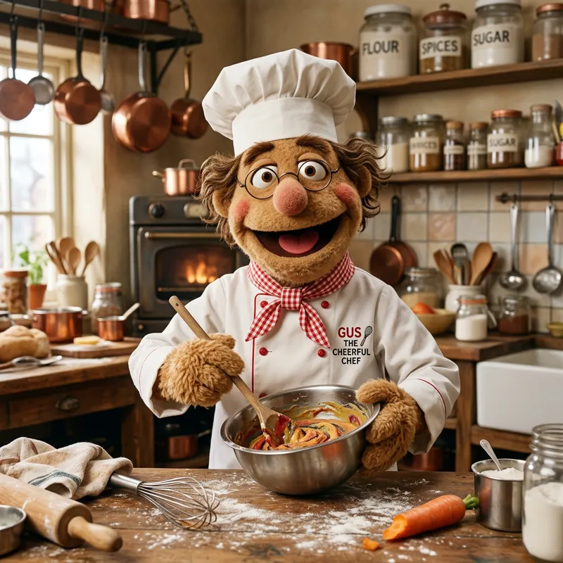 Cheerful Chef Muppet character with brown eyes, chef hat, eye glasses and brown hair.