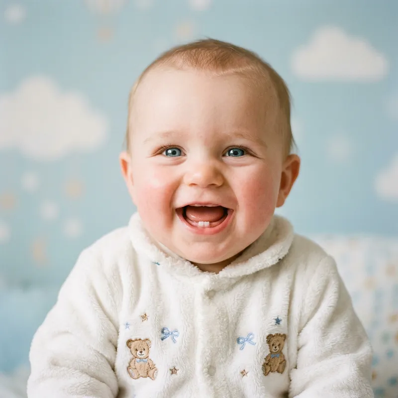 A close-up portrait of a cheerful and healthy baby boy. He has a fair complexion, light blue eyes full of curiosity, and sparse, light brown hair. The baby is seen laughing, showing off his first few teeth. His cheeks are a healthy pink. He is wearing a fluffy white onesie with small, embroidered teddy bears on it. The background is a soft pastel blue with diffused white clouds, creating a soothing and happy environment. The baby's joyous expression displays the epitome of innocence and the joy of early childhood.