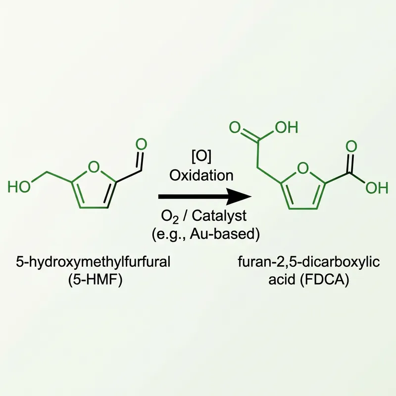 Illustrate the chemical conversion process where 5-hydroxymethylfurfural (5-HMF) is converted to furan-2,5-dicarboxylic acid (FDCA). Show two molecular structures, one for 5-HMF and another for FDCA. Include arrows between them signifying the transformation.