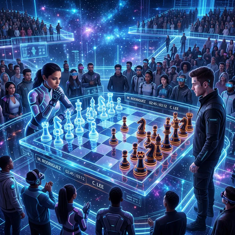 Envision an alternate reality where chess is played in the immersive digital universe known as the metaverse. The game board floats in space, encased in ethereal light. The chess pieces have been transformed into luminescent, high-definition digital objects, each piece casting a shimmering reflection onto the glassy surface of the board. Spectators of different genders, descents such as Caucasian, Hispanic, and East Asian, clothed in futuristic attire, watch the match intensify from the surrounding virtual landscape, in awe of this unique blend of traditional strategy game and advanced technology.