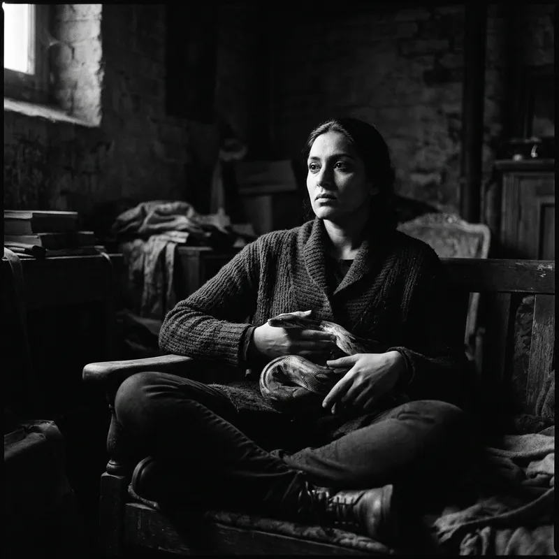 Generate an image of a woman of unspecified descent sitting in a dimly lit place. She has her legs comfortably placed and is holding a snake in her lap. The image should follow the technique of chiaroscuro employing dark tones and bright shades to bring out the subtle nuances. Her face shows a powerful expression. It should look like a piece of well-crafted photography in black and white developed from a 35mm film. The scene should have a potent, thought-provoking undertone.