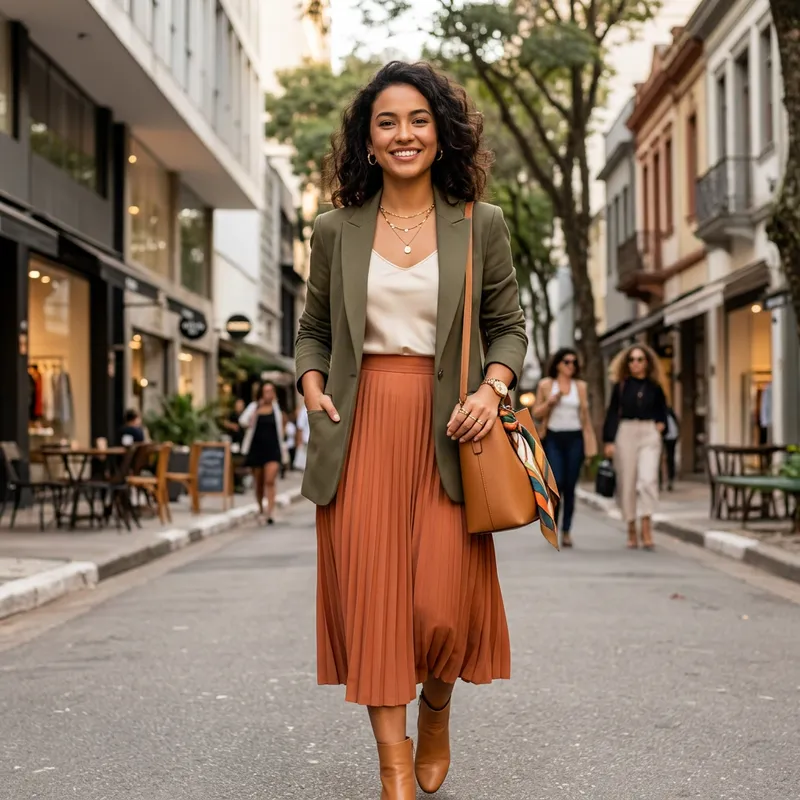 A young woman in a tasteful and elegant outfit including a stylish top, skirt, and fashionable accessories. The focus is on her confidence and chic attire. She is of a mixed descent, showcasing a beautiful fusion of cultures in her appearance. She sports a radiant smile, reflecting her lively personality and positive energy.