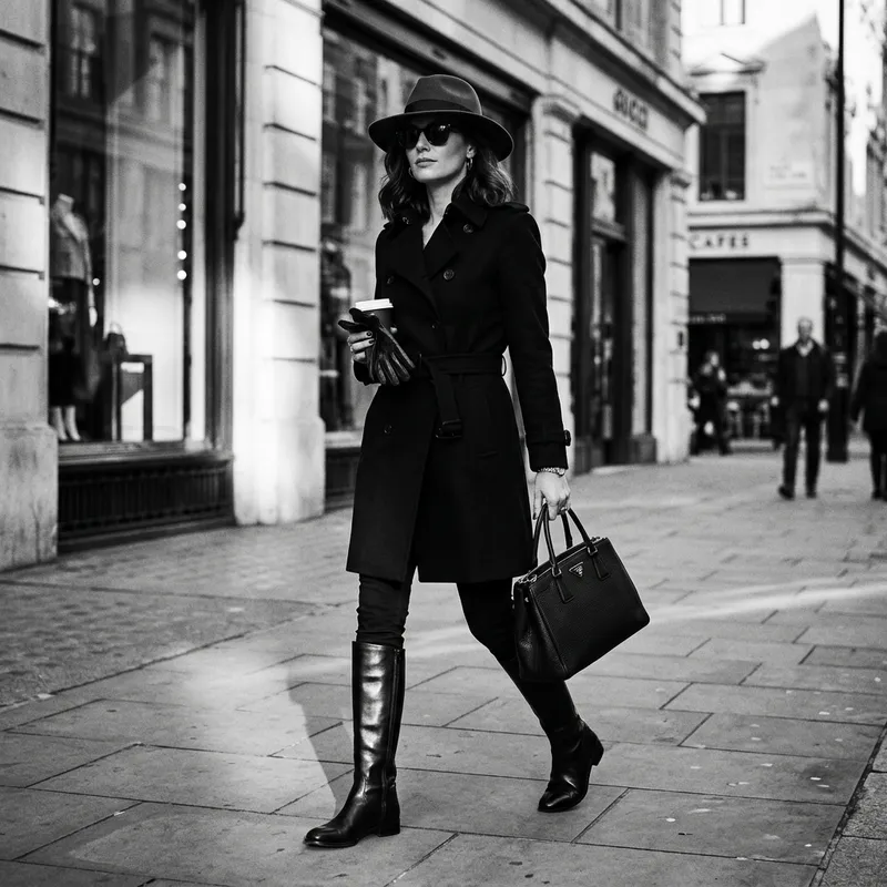 In the grayscale world of a black and white filter, a chic woman strides confidently along a sidewalk. Her clothing is the embodiment of luxury - a tailored coat hugging her body, a sophisticated hat sitting atop her styled, wavy hair. Her handbag, embellished with subtle yet expensive designs swings gently in stride with her pace. Every click of her high-heeled boots resonates with an aura of opulence and style. The shadows created by the black and white filter accentuate her strong contours and bold fashion choices, all the while hinting at her personality - both enigmatic and self-assured.