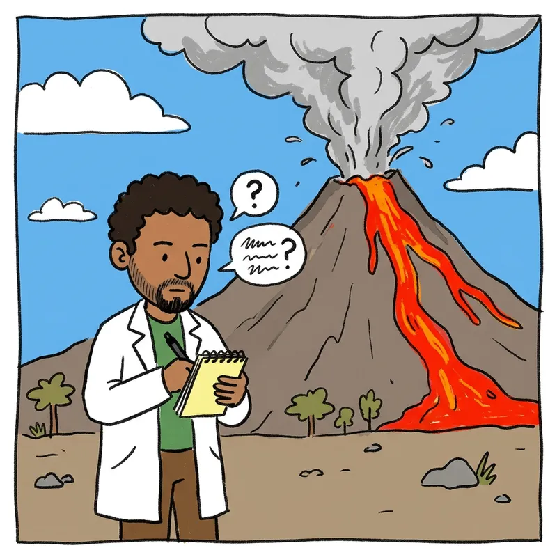 Create a comic panel drawn in a simplicity that even a child could replicate it. In this scene, a scientist is standing in front of a volcano. This scientist, of Middle-Eastern descent, is busily scribbling notes into a pocket-sized notebook. In the background, the volcano is erupting, producing a cloud of smoke and a stream of red-orange lava that flows downwards. Despite the dramatic scene behind him, the scientist remains focused on his research, highlighting the importance of science and curiosity in understanding our natural world.