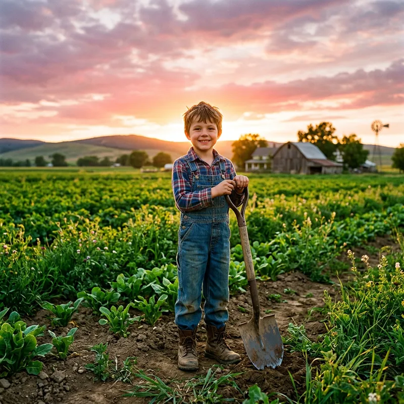 A young Caucasian boy dressed in traditional farmer clothing standing in a green field. He's smiling and holding a shovel in his hands. The sun is setting in the background, creating a beautiful backlight that highlights the boy. Clouds are painted across the sky in shades of pink and orange. This scene puts forward the peaceful and hardworking life of a farmer.