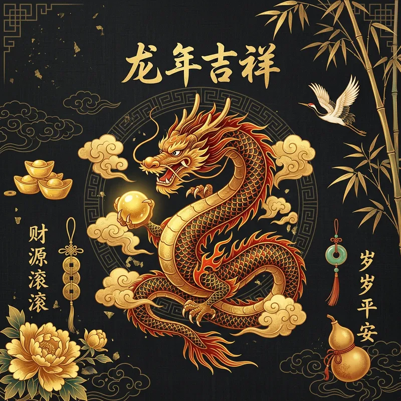 A Chinese-style screen wallpaper, designed for a dragon year theme. It is primarily for male users, and symbolizes peace, well-being and financial prosperity. The design incorporates traditional Chinese elements and motifs, and exudes a sense of tranquility and wealth. Dominant colors could be red, gold, and black. The majestic dragon holds center stage while other elements maintain harmony in the layout.