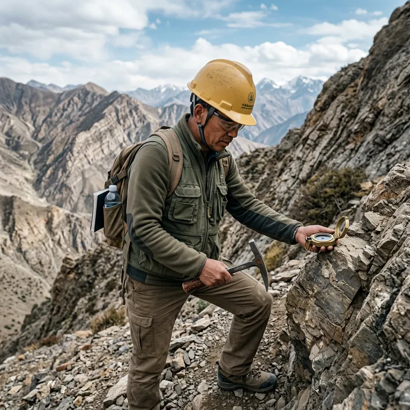A Chinese geologist is working in the mountains, holding a compass and a geological hammer in his hands.