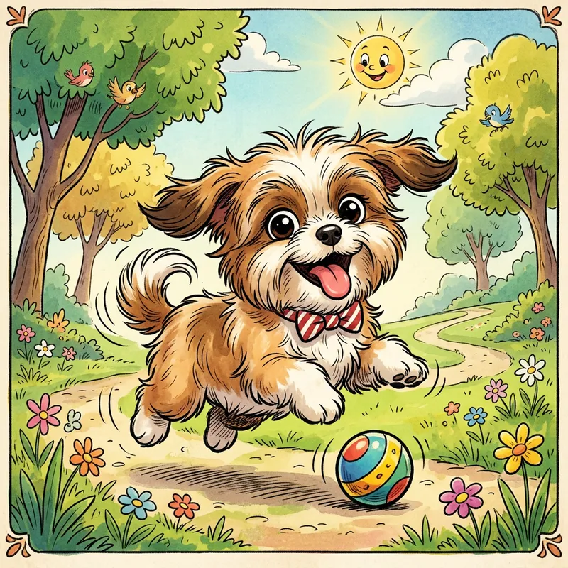 An adorable, fluffy, Shih Tzu with endearing eyes and a playful demeanor. Its hair is groomed immaculately, giving it a happy and lively look. The pup, known as Choppy, has a distinct animation style characterized by exaggerated features, bright colors, and a playful aesthetic, reminiscent of classic animation techniques from the early 1900s. True to its name, Choppy is often seen with a charmingly unkempt appearance, which, coupled with his jovial character, gives it an irresistible charm. The focus should be on playfulness, joy, and the cuteness inherent to this type of dog breed.