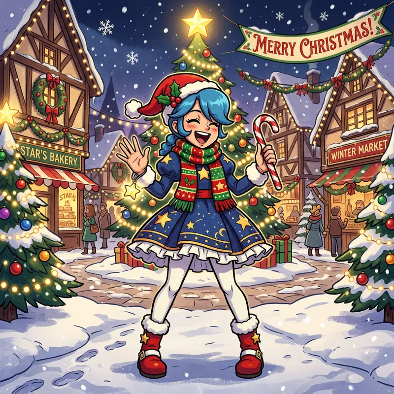 A vintage-inspired video game character, reminiscent of 'Annie of the Stars', celebrating Christmas. She has an open missive expression, blue hair styled in a bob cut, and a whimsical star-themed costume. She is adorned with festive elements like a Santa hat, a red and green scarf, and she's holding a candy cane. The scene is set in a Christmas setting with falling snow, Christmas trees, lights and decorations.